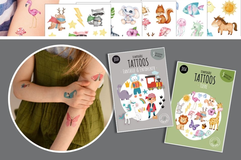 Die kindgerechten Motive der Tattoos "Naturkinder", "Du & Ich" oder „Tiere“ sind liebevoll gestaltet mit niedlichen Einhörnern, Waldtieren, fantasievollen Monstern oder Drachen. Die Kinder-Tattoos von JEKA sind einfach anzuwenden, dermatologisch getestet und halten bis zu 5 Tage. Zudem sind sie 100 % vegan und verfügen über eine biologisch abbaubare Papierabdeckung. Zum Ablösen der Tattoos verwenden sie etwas Creme oder Hautöl.