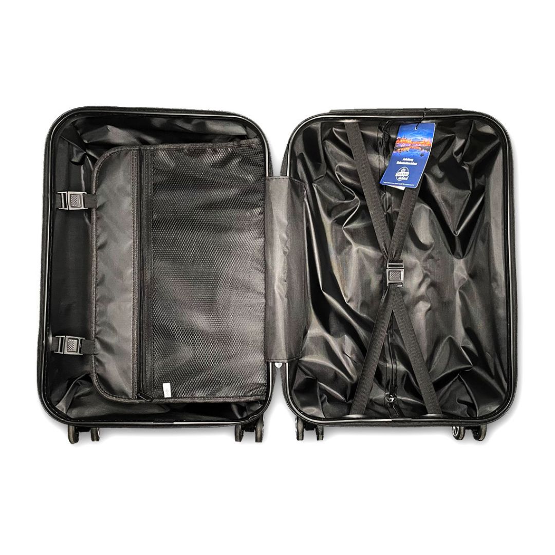 Kofferschalen aus hochflexiblem ABS-Kunststoff mit Hochglanzmotiv inklusive ablösbarer PC-Beschichtung zum Schutz, 4 Rollen (Doppelräder, 360 Grad drehbar), integriertes TSA-Zahlenschloss, abteilbarer Innenraum inkl. Packriemen, ausziehbarer Teleskopgriff aus Aluminium.