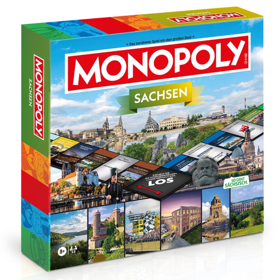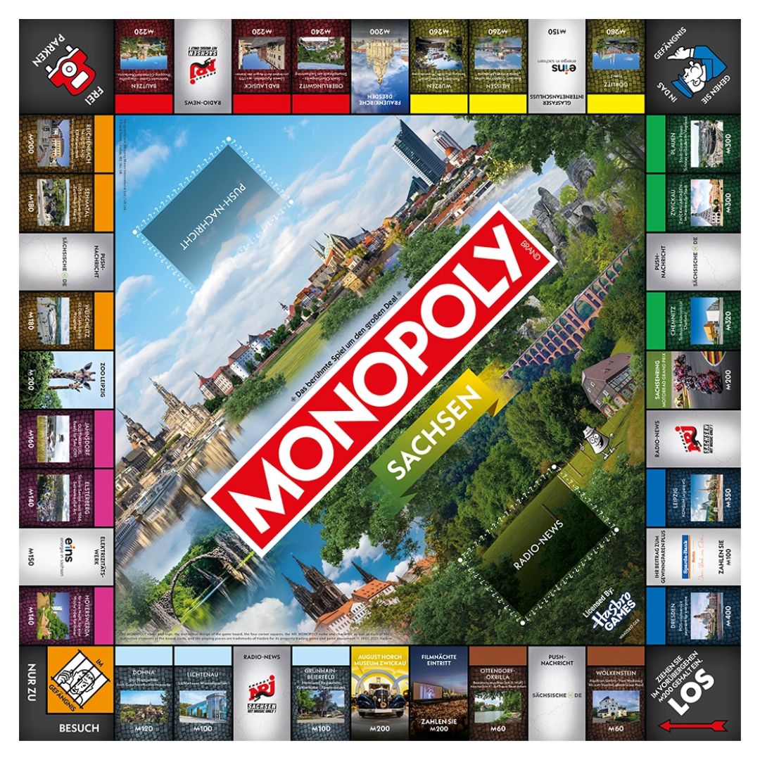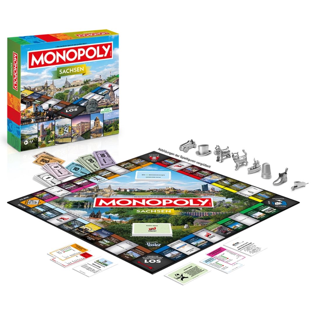 - Regional-Edition Sachsen beinhaltet: 1 Spielbrett, 8 Spielfiguren, 28 Besitzrechtskarten, 32 Karten, ein Satz Monopoly-Spielgeld, 32 grüne Häuser, 12 rote Hotels, 2 Würfel, 1 Spielanleitung